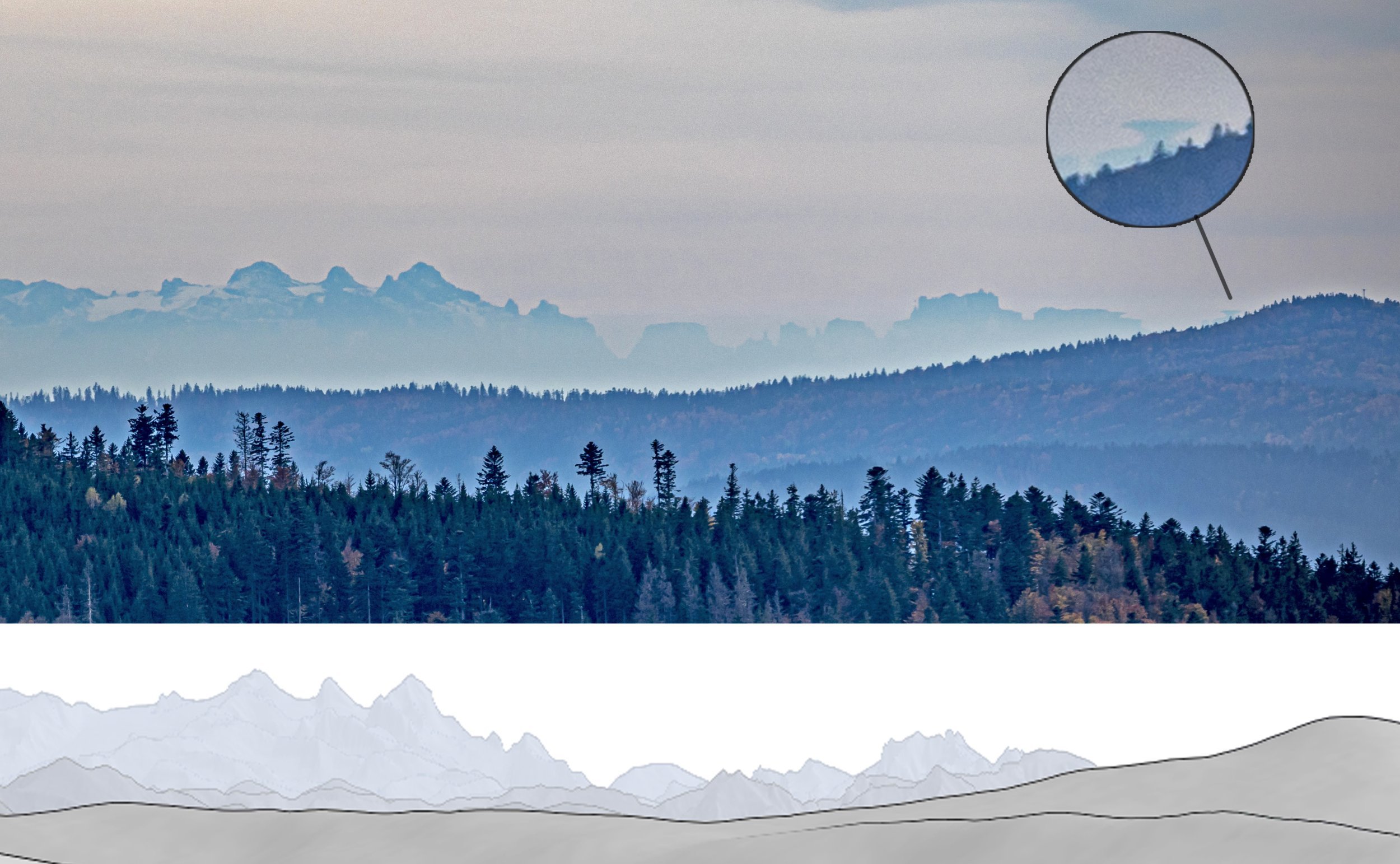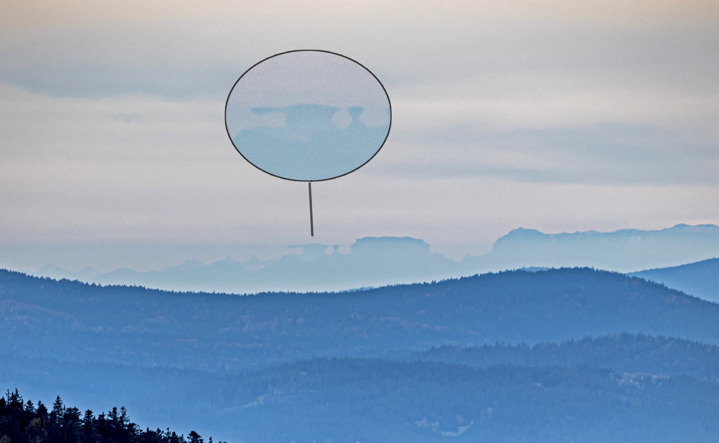 Zrcadlení Alp z Pancíře 26.10.2021 po poledni - pohled směrem k Dachsteinu, v dolní části snímku je zobrazena scenérie bez zrcadlení - patrné je, jak kopce v pravé části snímku jsou zdeformované a dokonce můžeme díky zrcadlení vidět kopec, který běžně z daného místa vidět není. Vidíme totiž jeho odraz, který přesáhne horizont