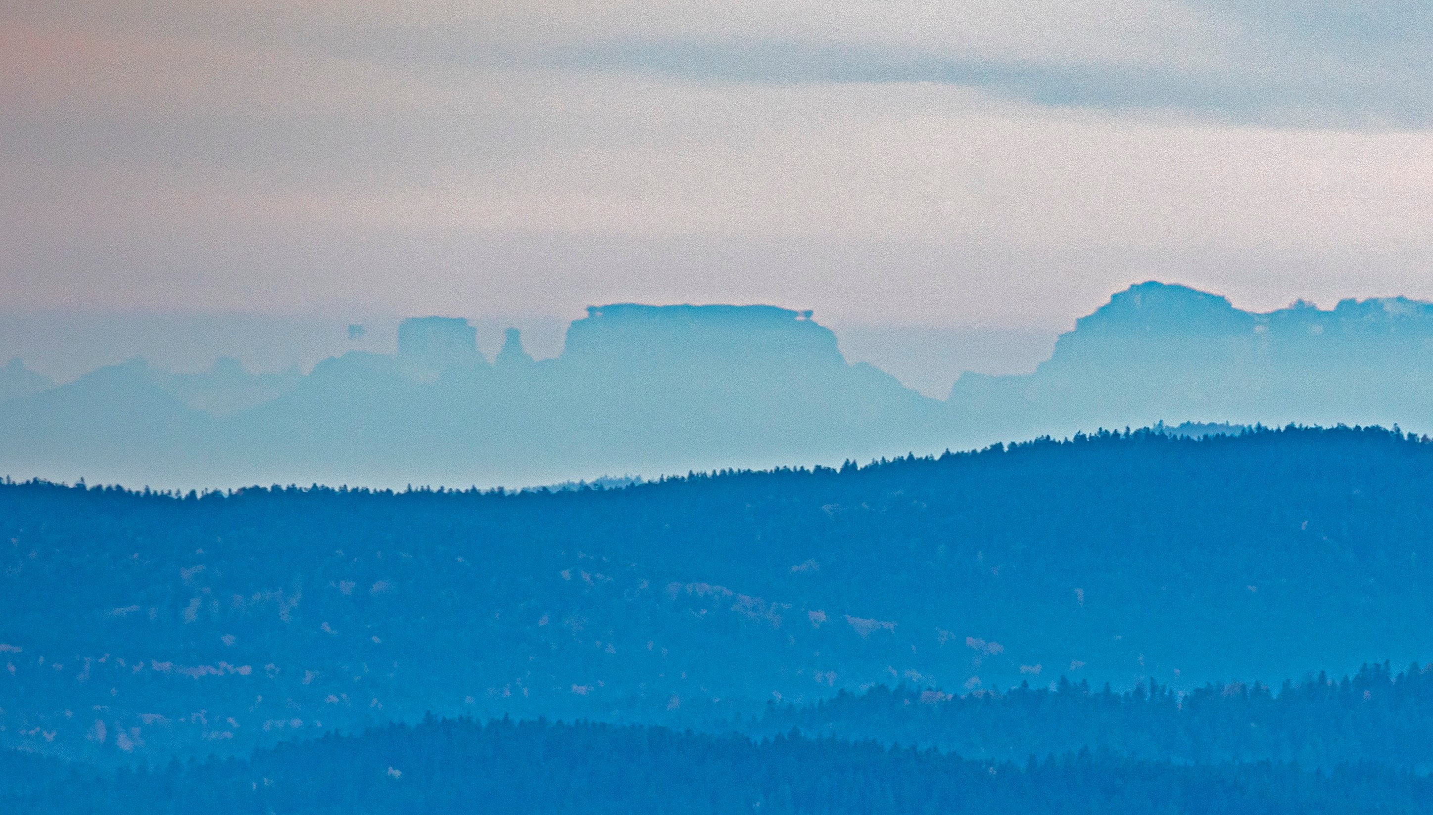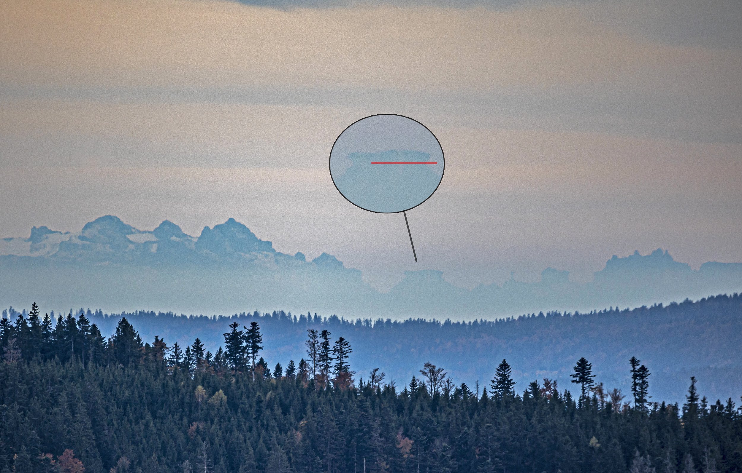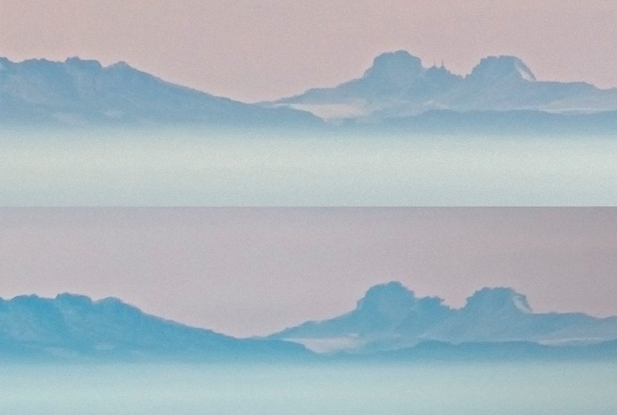 Pohled na Grossglockner z Pancíře 26.10.2021 po poledni - zrcadlení se v čase mění - na prvním snímku jsou tak u vrcholu jakési dvě věže a po pár minutách naopak mizí