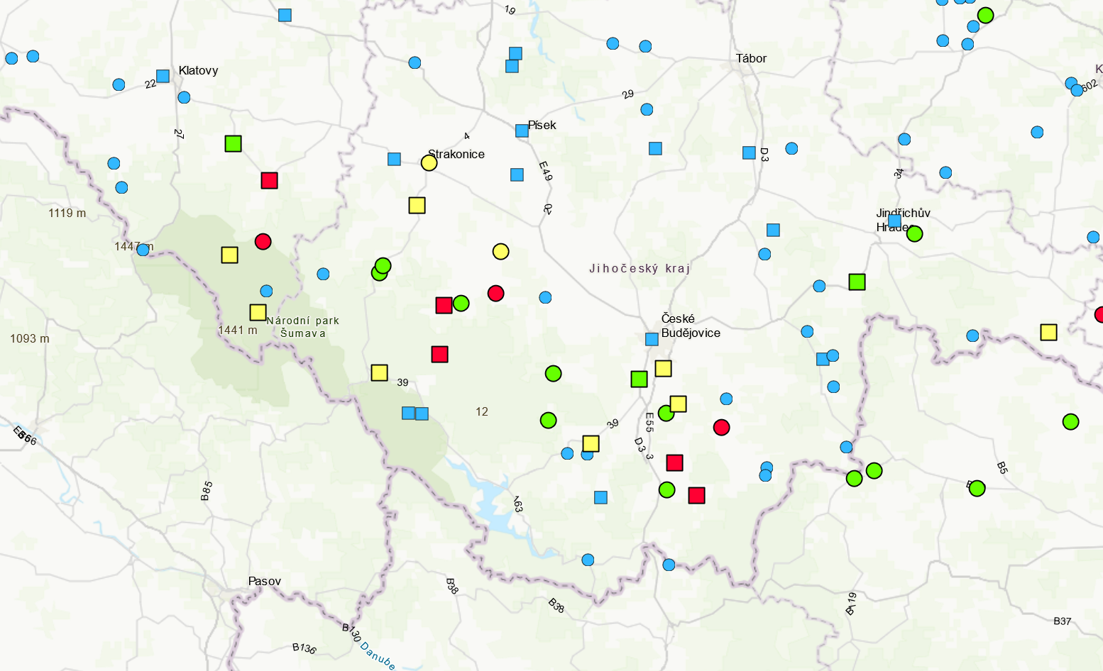 Stavy řek na jihu Čech v 9:00 - několik jich dosahuje 3. SPA (označeny červeně)
