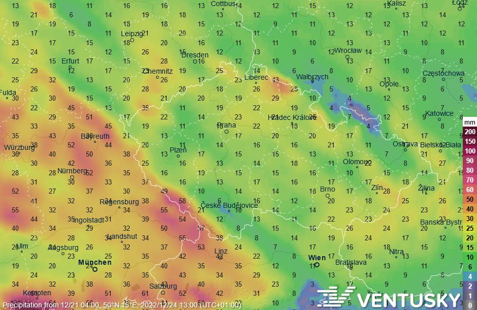 Očekávané srážkové úhrny do sobotních 12:00 (za 72 hodin) podle modelu ICON - hlavně v oblasti Šumavy se čekají vydatné srážky
