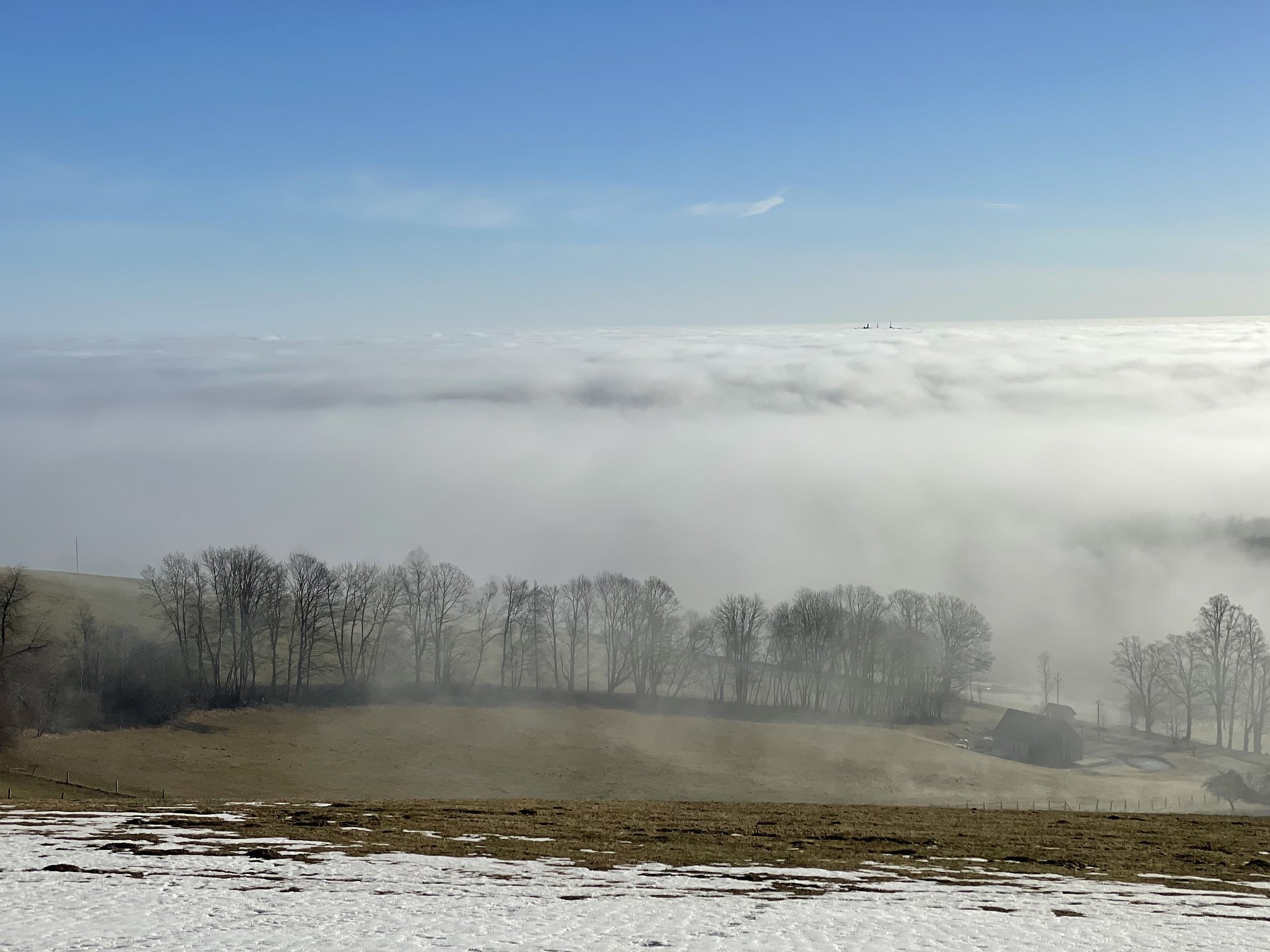 Zámyšl u Šumavy - hranice, kde začínala mlha ležela ve výšce pod 900 m