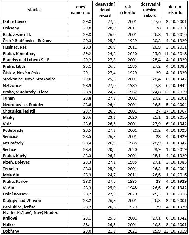 Tabulka dnešních rekordů dosažených na stanicích ČHMÚ