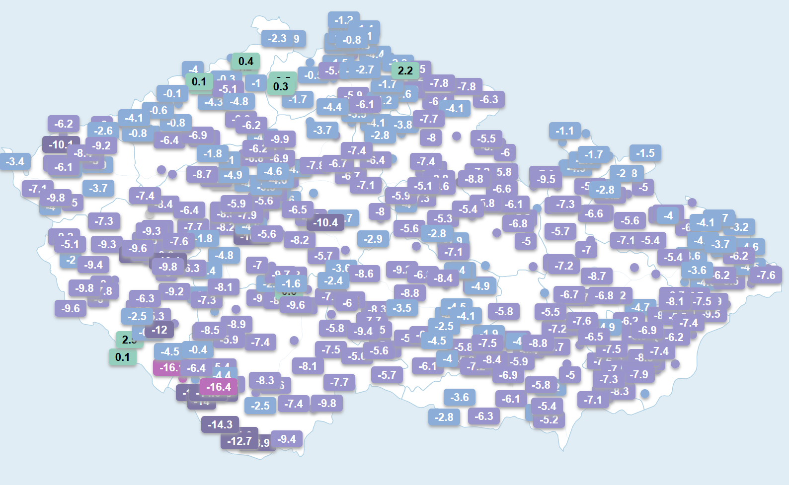 Teplota i ve městech ojediněle klesla až k -10 °C, zítra ráno na řadě míst alespoň poprašek sněhu