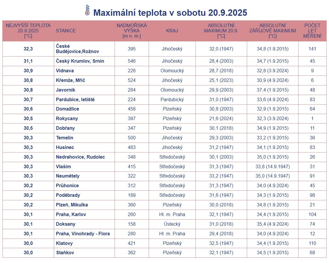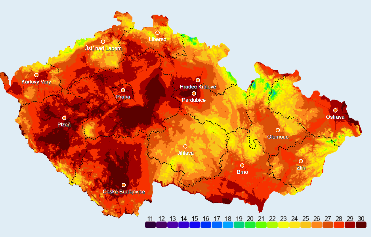 Teplota překonala tropických 30 °C, nejtepleji bylo v Českých Budějovicích