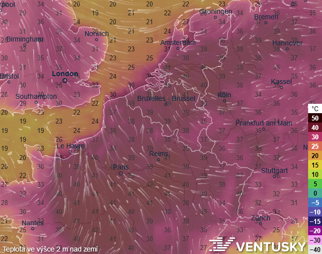 Na západě Evropy zítra vyvrcholí vlna veder. Nejhorší situace se očekává ve Francii, Belgii, Nizozemsku, Lucembursku, Anglii a na západě Německa. Ve všech těchto oblastech se očekávané teploty budou blížit absolutním teplotním rekordům a hrozí jejich překonání. Odpolední maxima zde zítra vystoupí na 36 °C až 40 °C, ve Francii až na 42 °C. V Belgii přitom činí absolutní maximum (tedy nejvyšší naměřená teplota v historii) 38,8 °C a pochází z roku 1947. V Nizozemsku naměřili zatím nejvíce 38,6 °C v roce 1944. V Německu absolutní rekord pochází z roku 2015 a činí 40,3 °C. V Anglii bylo nejtepleji v roce 2003, kdy zde teplota vystoupila na 38,5 °C. Jen ve Francii překonání nedávno dosaženého absolutního maxima nehrozí. Na konci června bylo na jihu Francie i přes 45 °C. Tentokrát budou vedra vrcholit hlavně na severu Francie. Například v Paříži bylo zatím vůbec nejtepleji v roce 1947, kdy zde bylo 40,4 °C. Zítra se v této metropoli očekává 39 °C až 40 °C.