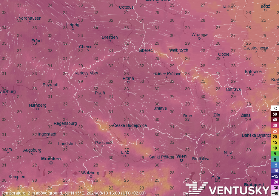 Očekávané teploty v úterý odpoledne - dostanou se na většině území nad 31 °C