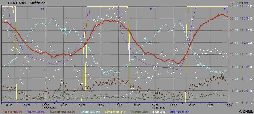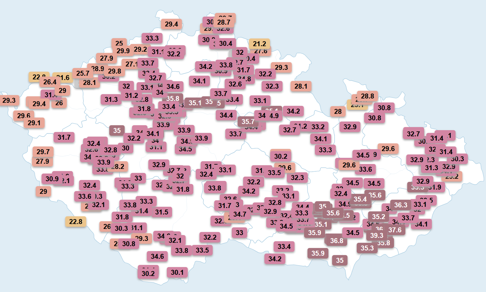 Teploty dnes v 16:30 - hlavně na jihu Moravy se dostávaly plošně nad 35 °C