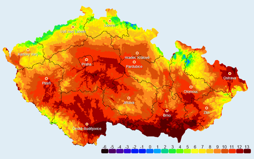 Teploty dnes ve 14:30 - na jihu území se dostávaly přes 13 °C