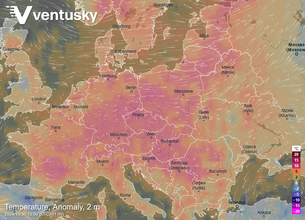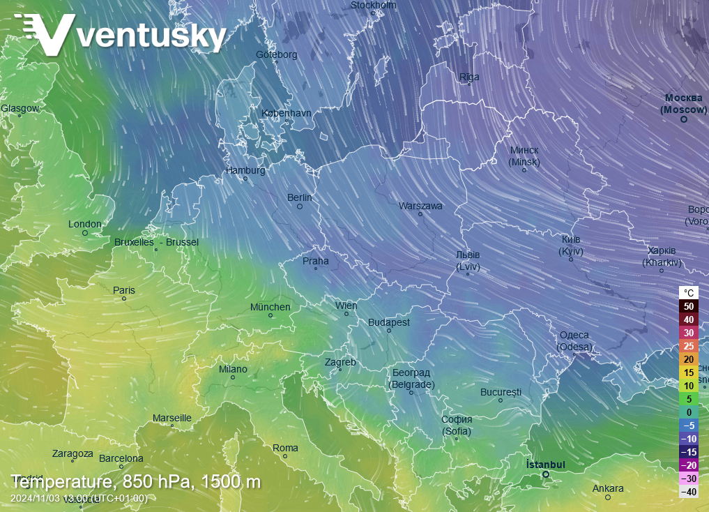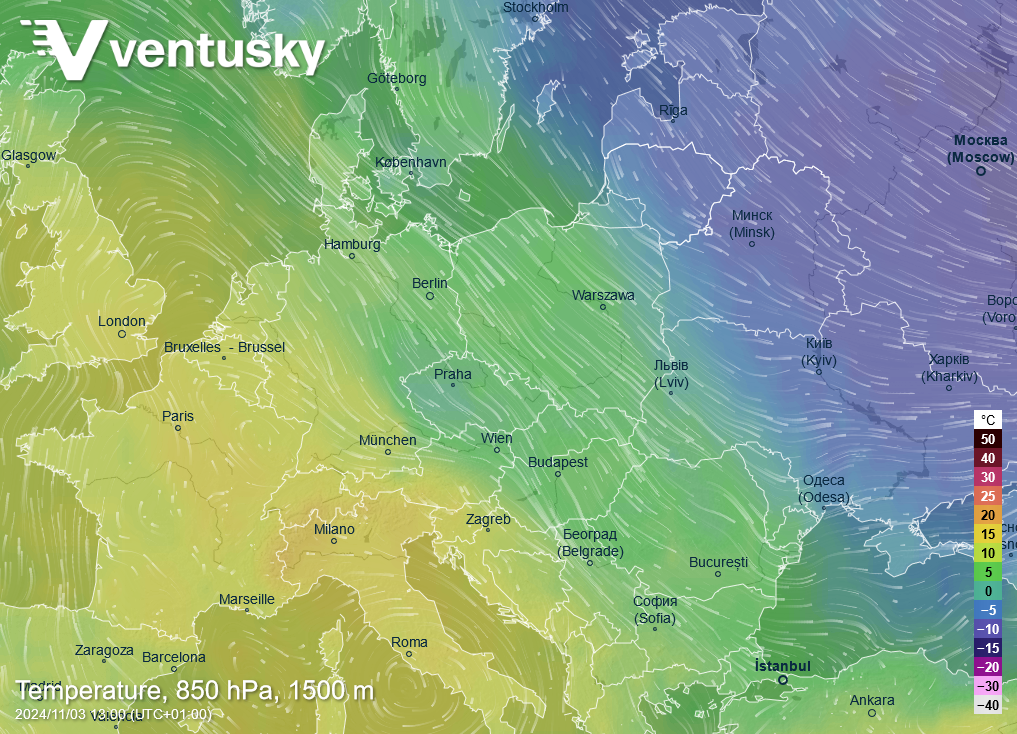 Teplota ve výšce 1500 m nad zemí (850 hPa) v neděli odpoledne podle modelu ICON - model očekává průnik studeného vzduchu na východ Evropy