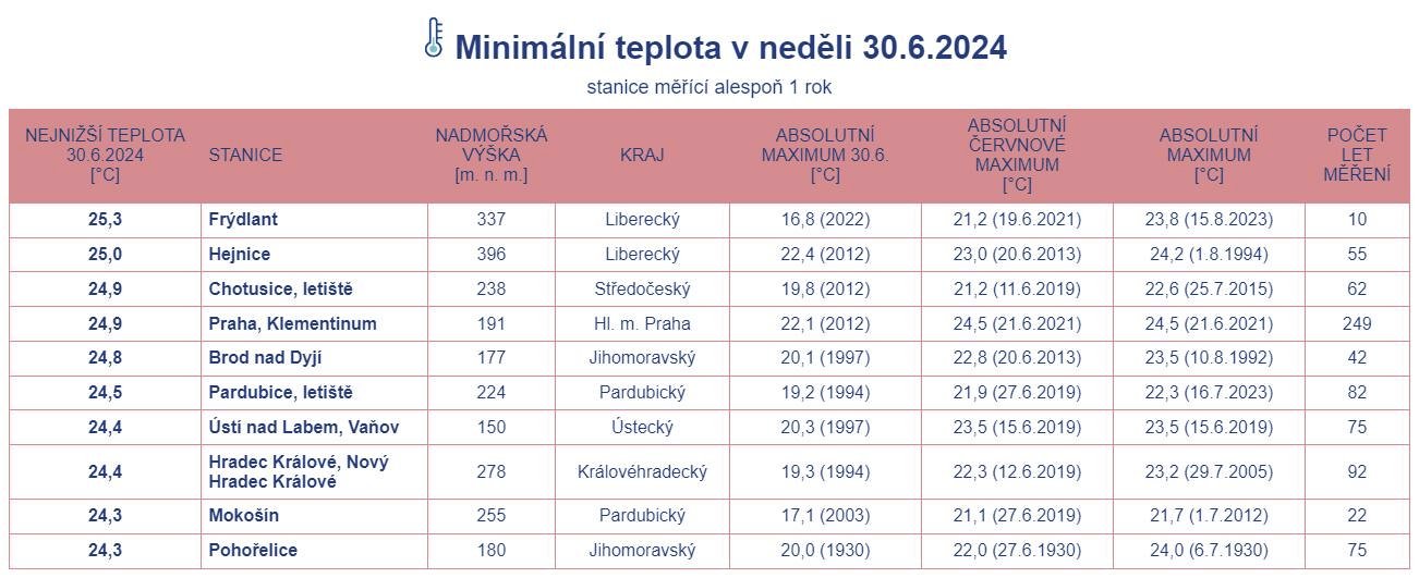 Teplota v noci na pár stanicích neklesla pod 25 °C, zaznamenány byly rekordy