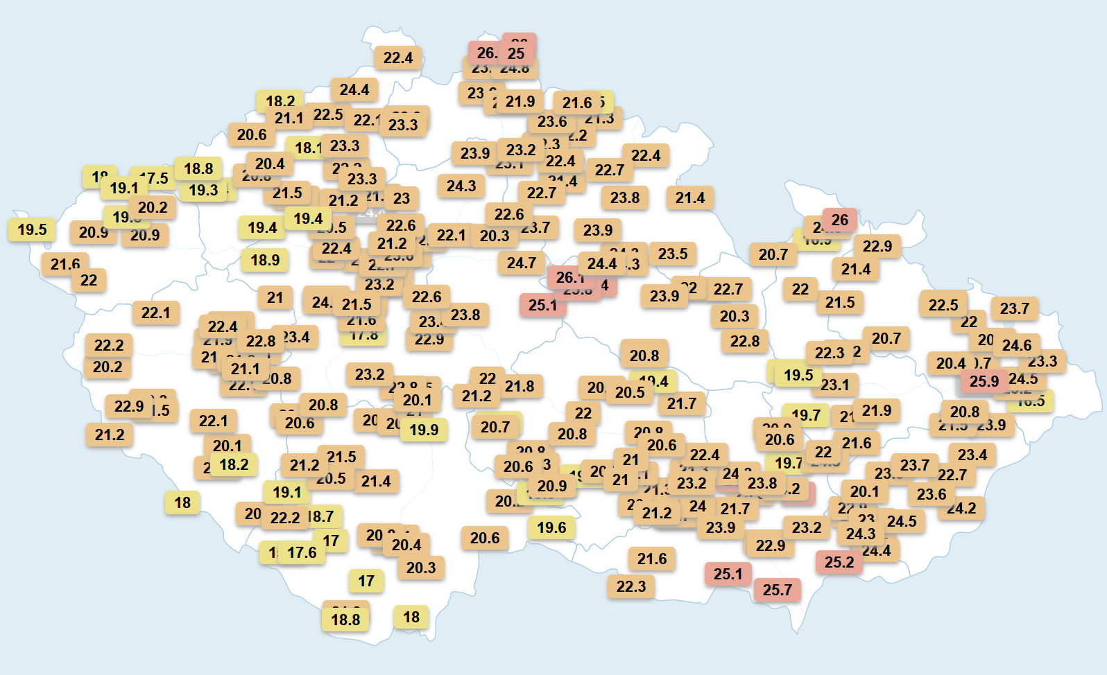 Teploty dnes ráno v 6:00 - na většině území byly nad 20 °C, ojediněle i nad 25 °C