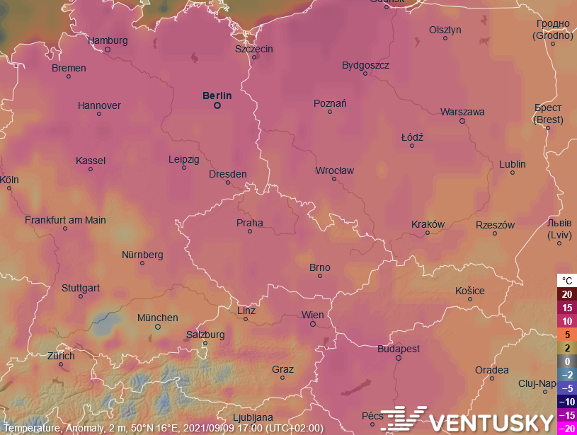 Odchylka teploty vzduchu ve čtvrtek odpoledne vůči průměru 1981-2020 - v celé střední Evropě budou teploty výrazně nadprůměrné