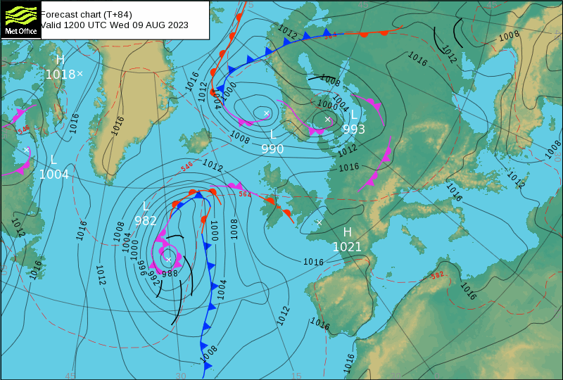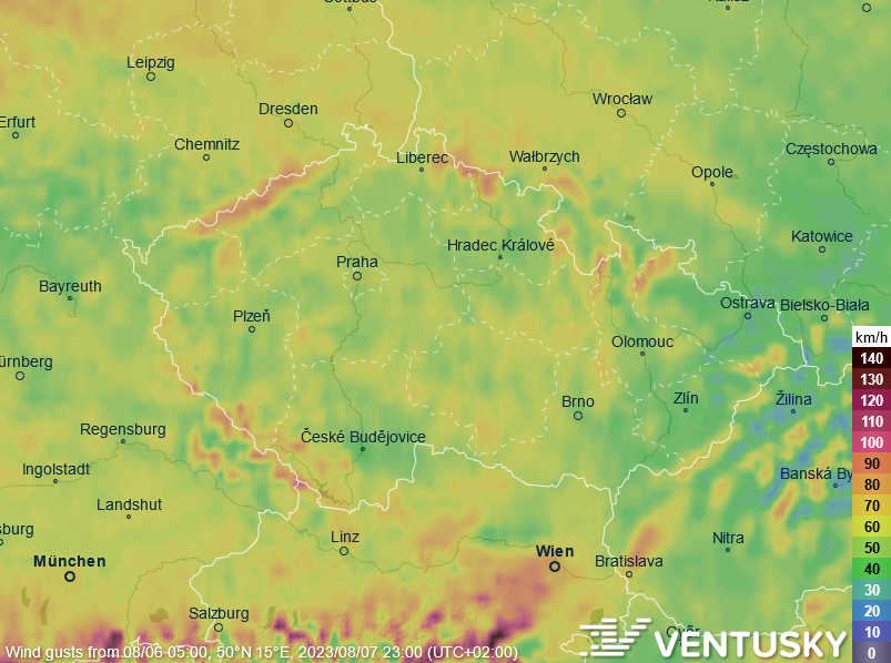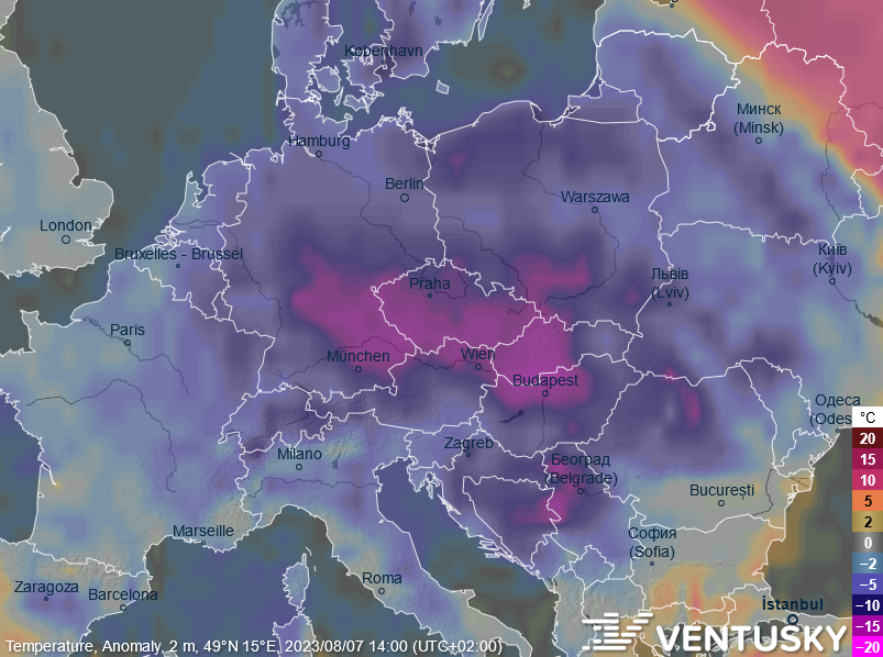 Odchylka teplot od průměru za posledních 40 let v pondělí odpoledne - ve střední Evropě se očekávají výrazně podprůměrné teploty, na našem území bude odchylka největší (dosáhne 10 °C)