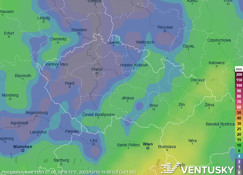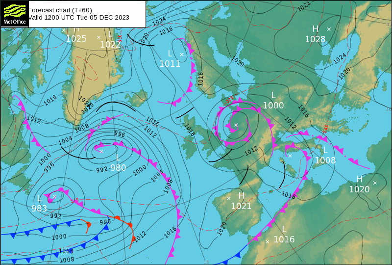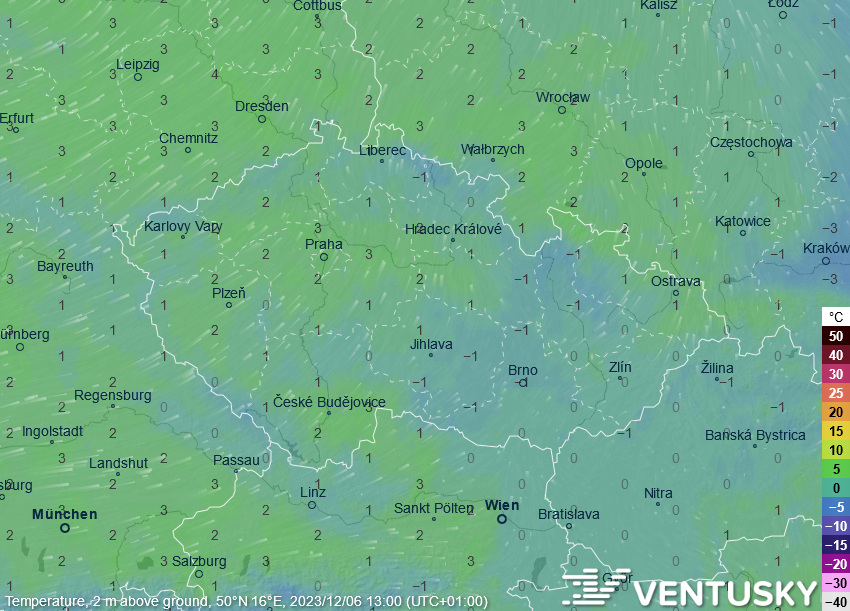 Synoptická situace v úterý v poledne - počasí u nás začne ovlivňovat tlaková níže, vydatné srážky už ale nepřinese