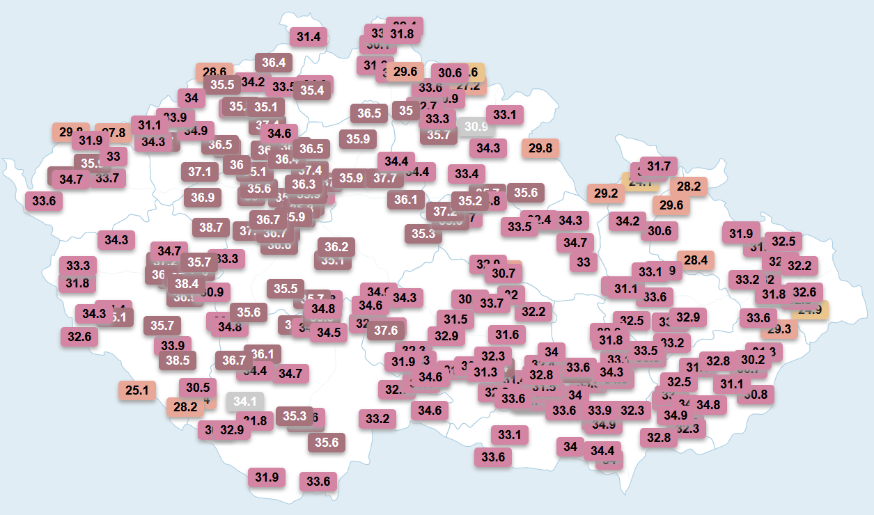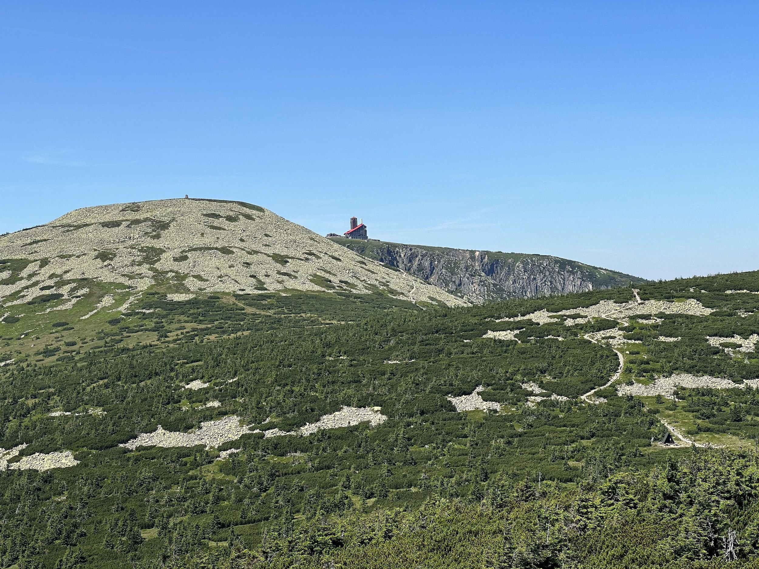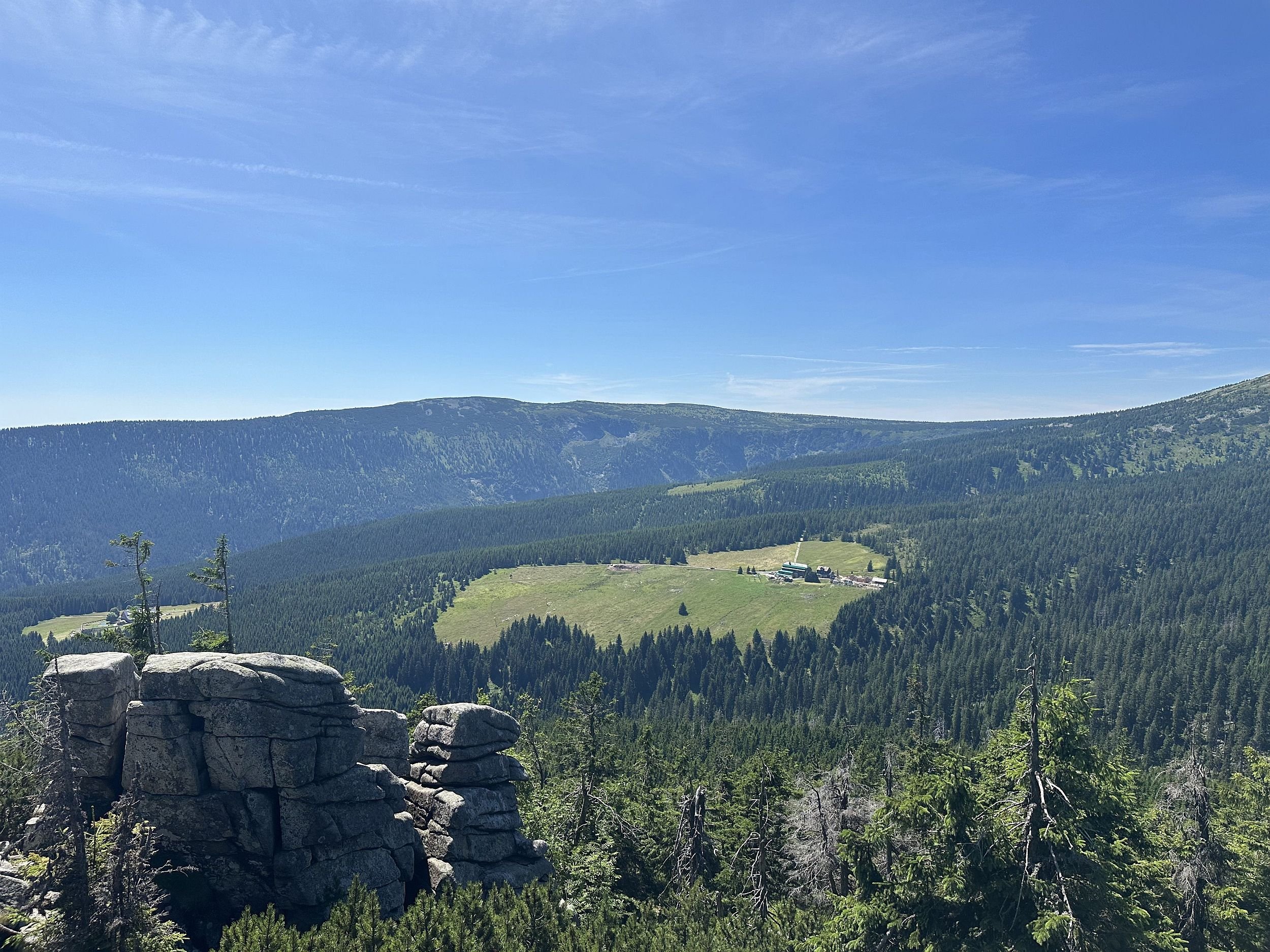Dnešní odpolední výhled z hřebenu Krkonoš směrem na Brádlerovy boudy a Vrbatovu boudu - odpoledne zde bylo slunečno a kolem 23 °C