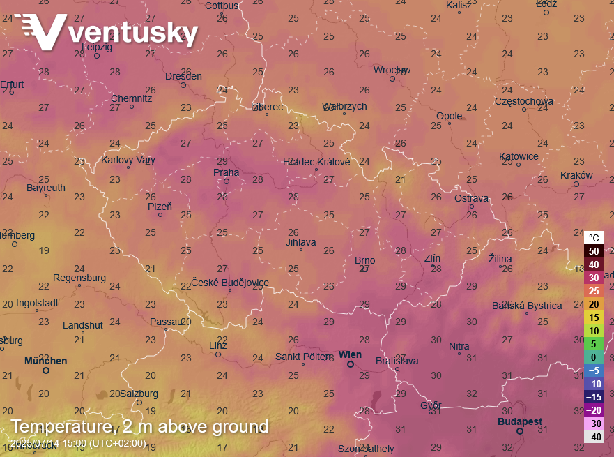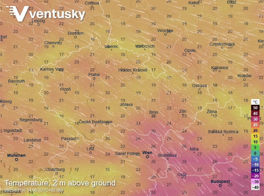 Očekávané teploty ve středu odpoledne