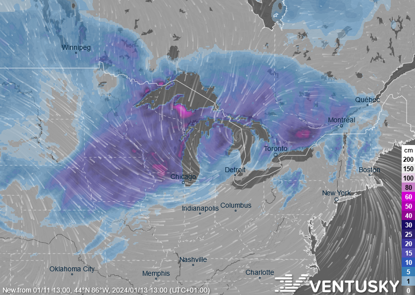 Množství nového sněhu do sobotního rána místního času - u Velkých Jezer napadne i přes půl metru sněhu, sněžit zde se slabší intenzitou bude i během soboty a neděle