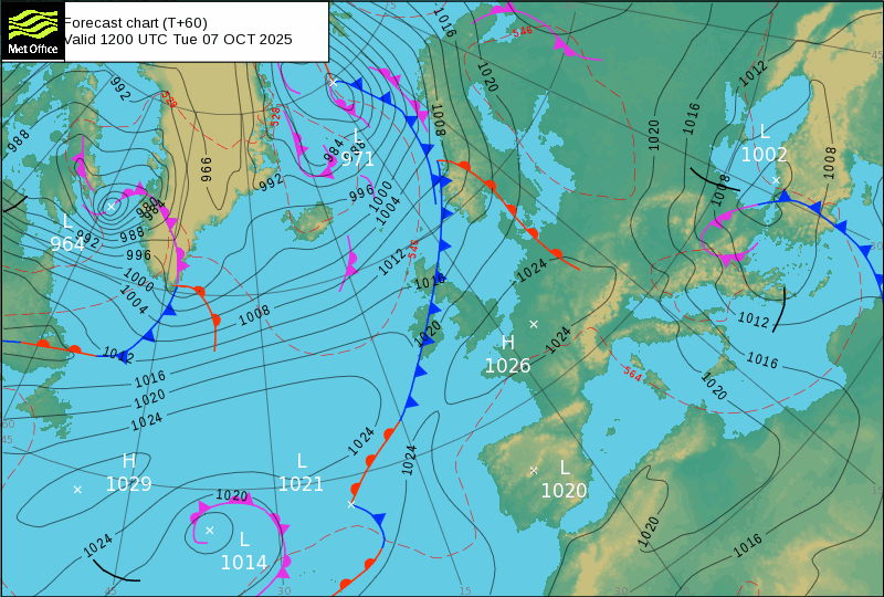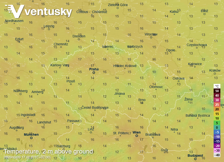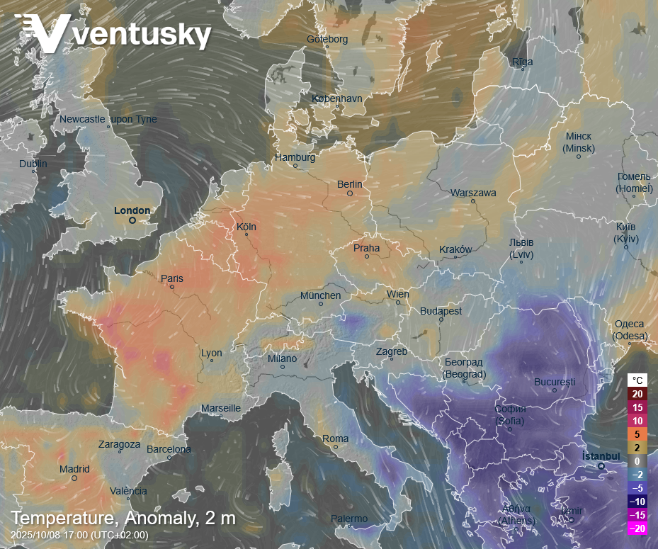 Odchylka teplot od průměru za posledních 40 let ve středu odpoledne - studený vzduch už bude jen na Balkáně, jinde budou teploty většinou normální
