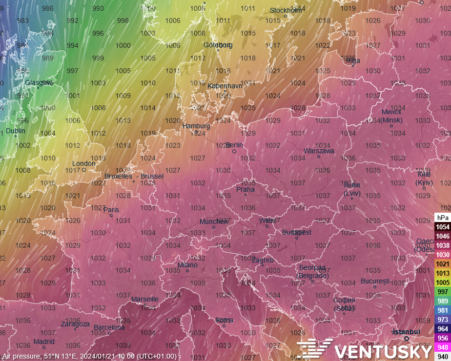 Tlak vzduchu v Evropě v neděli dopoledne v 10:00 - dosáhne až 1037 hPa