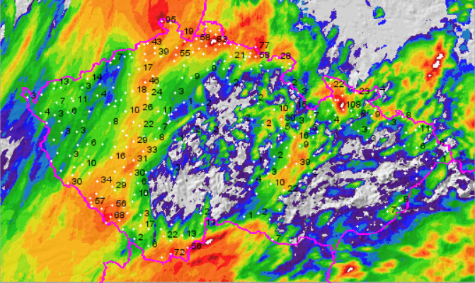 Srážky od večerejších 9:00 do dnešních 9:00 - nejvíce pršelo na severu Čech, na Šumavě a v Jeseníkách