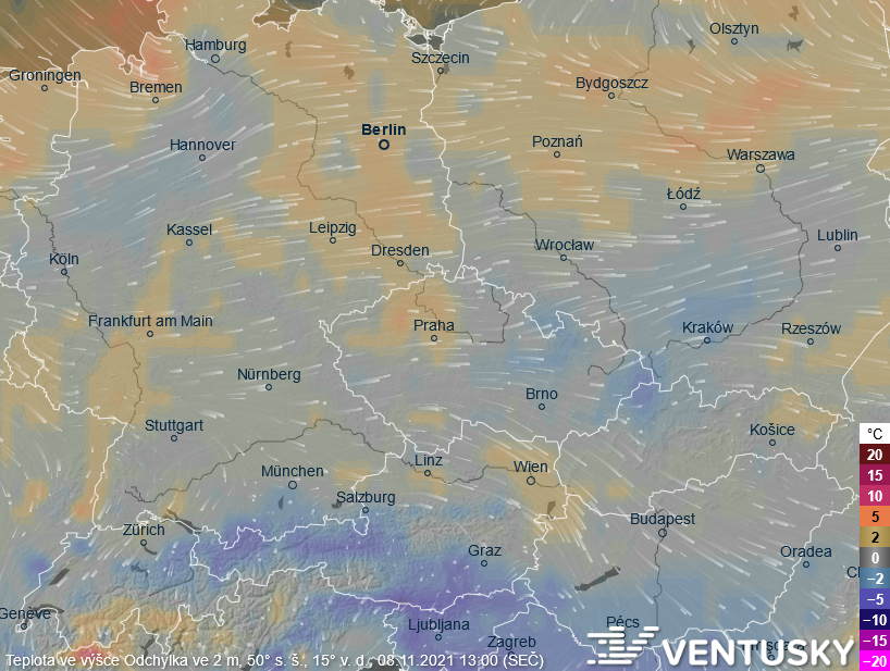 Odchylka teploty vzduchu v pondělí odpoledne vůči průměru 1981-2020 - teploty ve střední Evropě budou normální