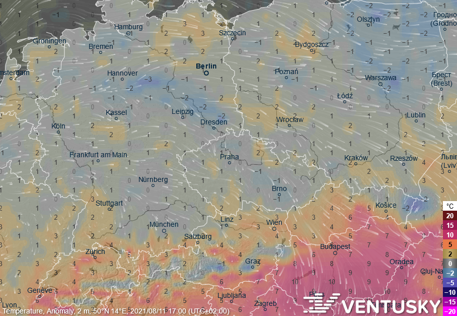 Ochylka teploty od dlouhodobého průměru ve středu odpoledne - teploty ve střední Evropě budou přesně odpovídat dlouhodobým průměrům pro tyto dny, nadprůměrné teplo bude jen na jihu (například Maďarsko v novém týdnu čeká výraznou vlnu veder)