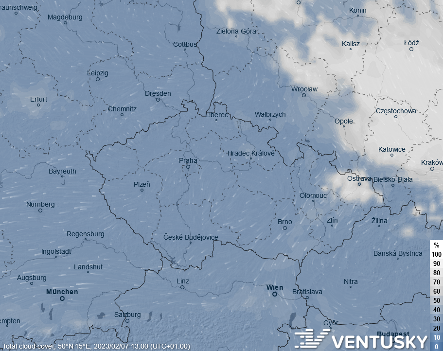 Množství oblačnosti v úterý v poledne - čeká nás po delší době vyloženě slunečný den