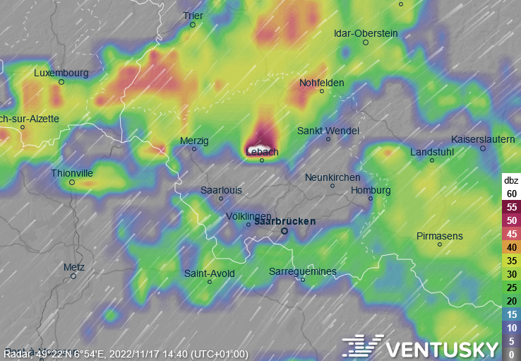 Radarový snímek bouřky v Sársku, při které se vyskytlo tornádo - odrazivost dosáhla až 60 dBZ (viz bílá barva), zdroj: ventusky.com