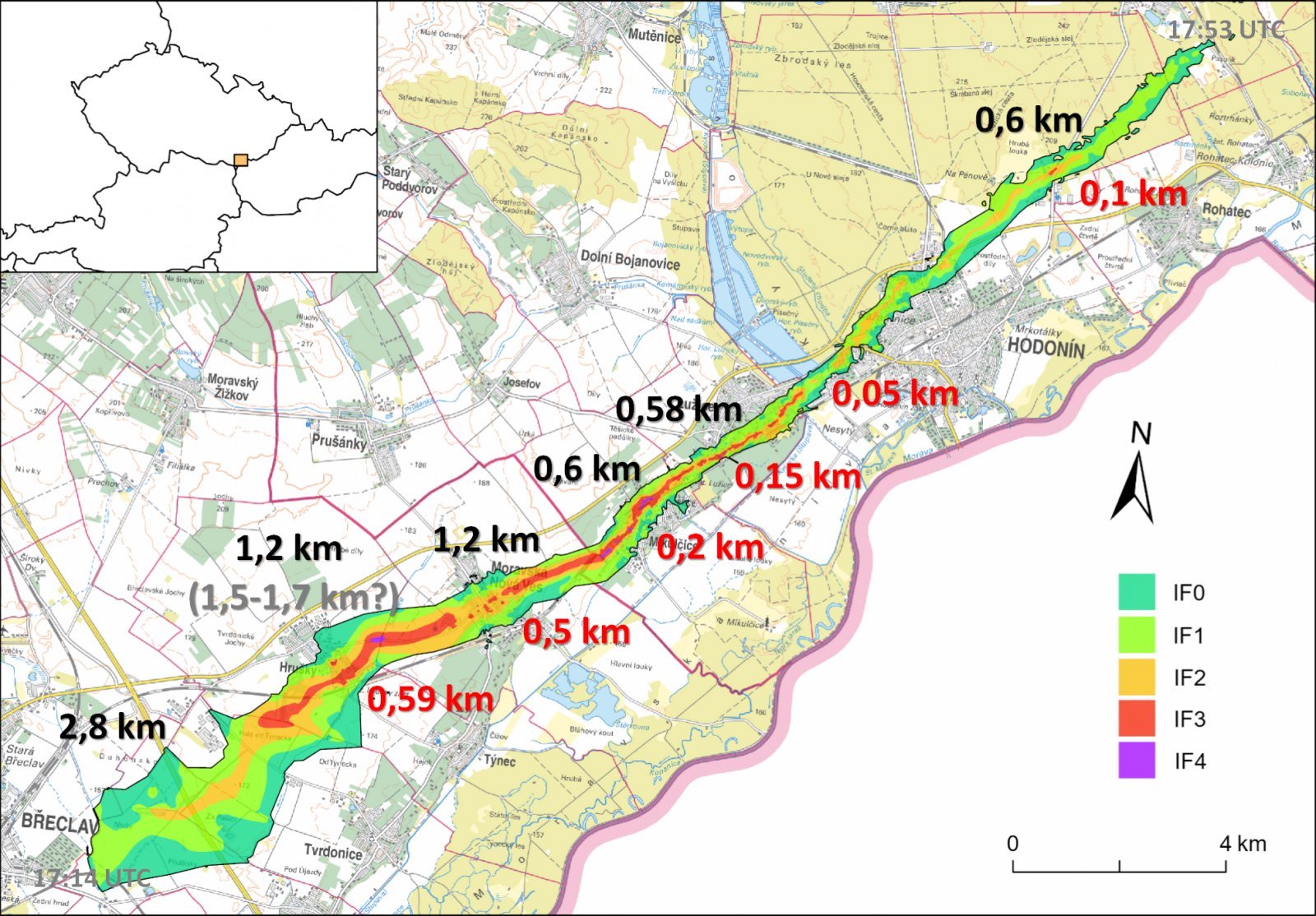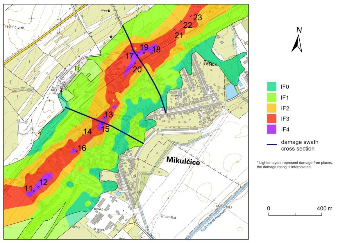 Podrobná mapa škod v Mikulčících s přiřazenou intenzitou tornáda podle IF škály