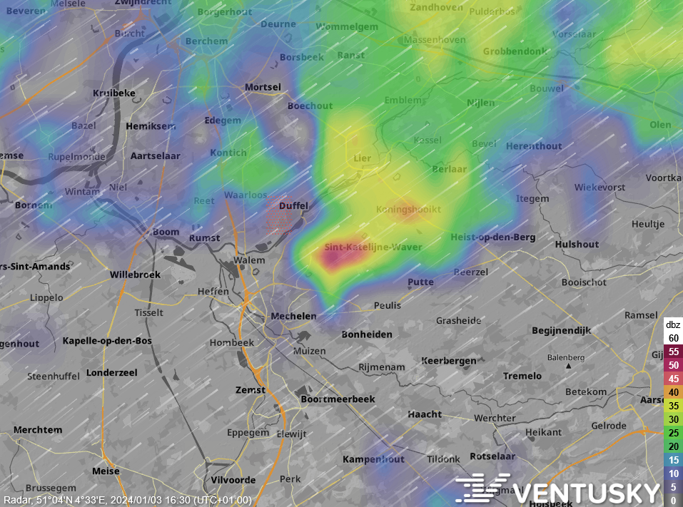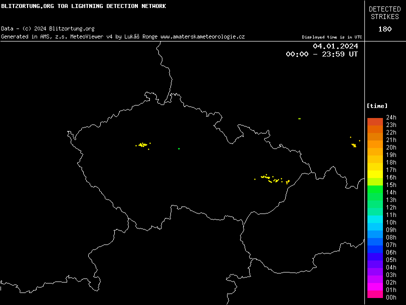 Sumace blesků za 4. ledna (barevně odlišena dle času)