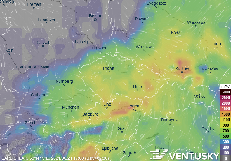 Hodnoty CAPE*shear ve čtvrtek 24.6.2021 ve 20:00