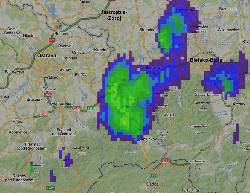Radarový snímek z 20:00 - nad Třineckem se udržuje poměrně malá přeháňka, která přinesla až 16 cm sněhu