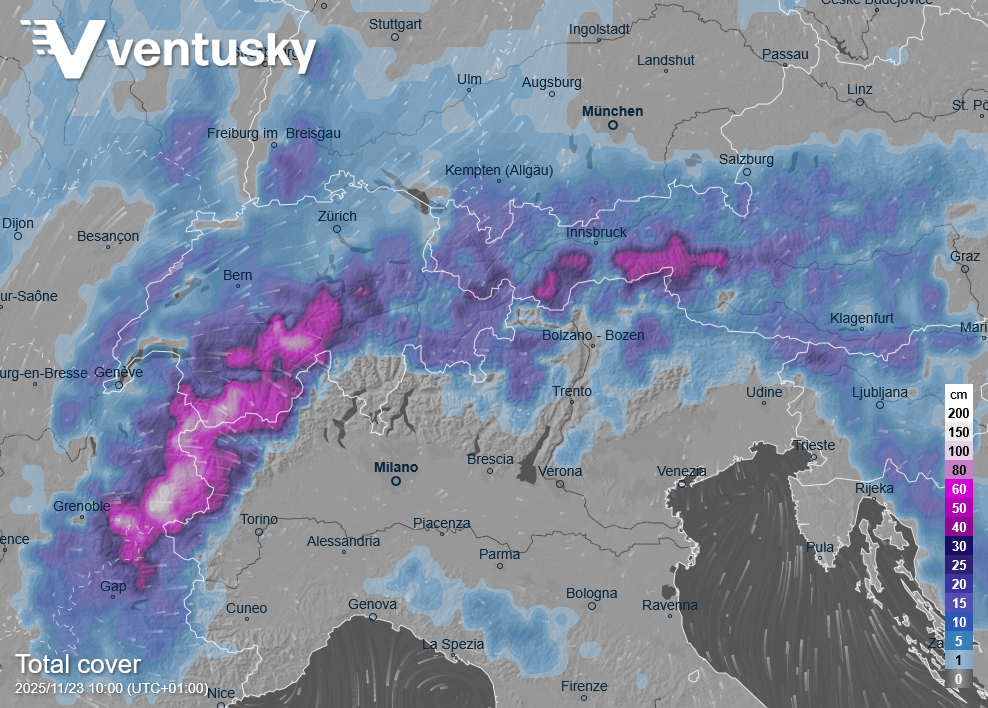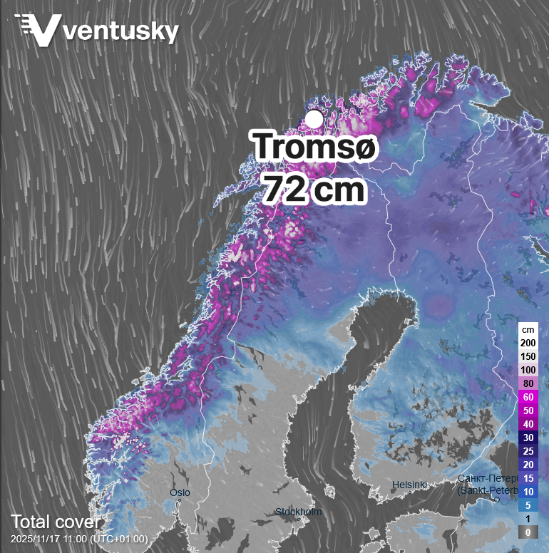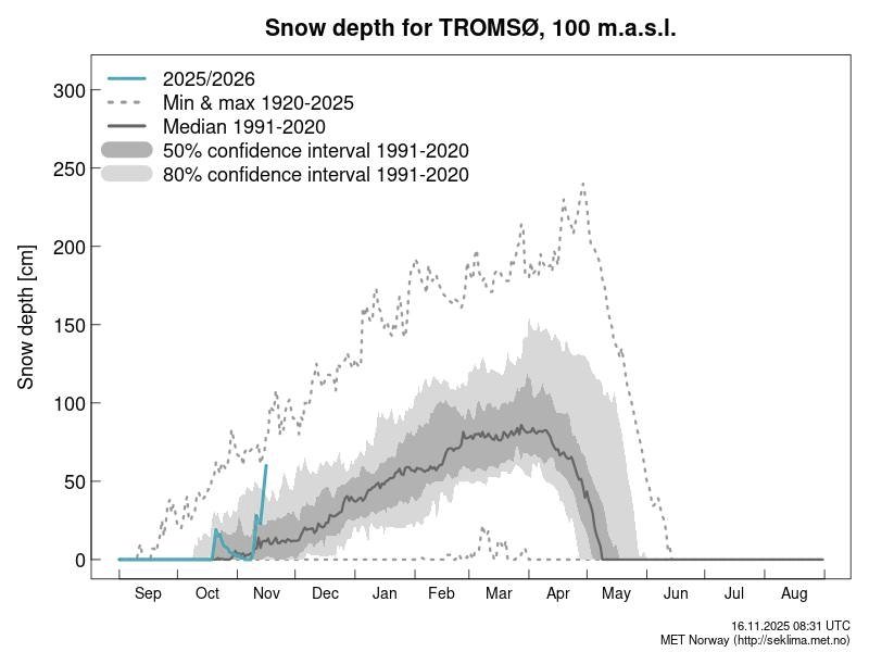 Měření sněhu ze stanice Tromsø - šedě jsou znázorněny dlouhodobé průměry pro zimy včetně maximálních hodnot, barevně je letošní sezona