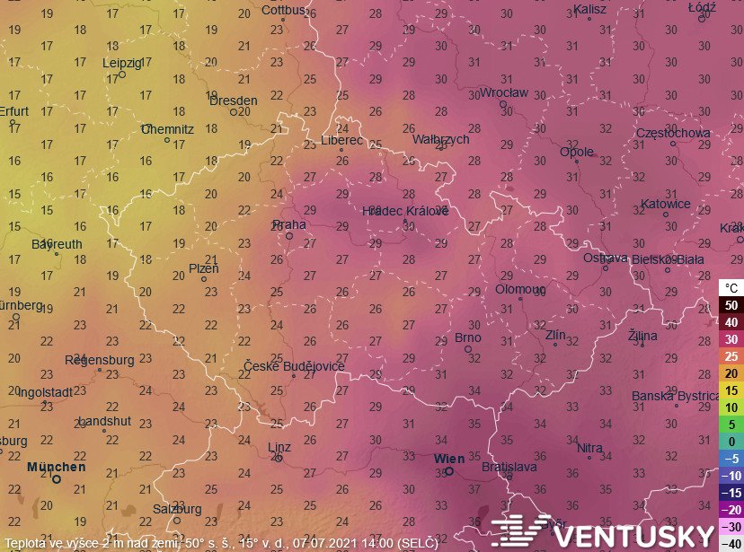 Teploty ve středu ve 14:00 - v Karlovarském kraji bude stěží 20 °C, na jihu Moravy naopak teploty zamíří až na 34 °C