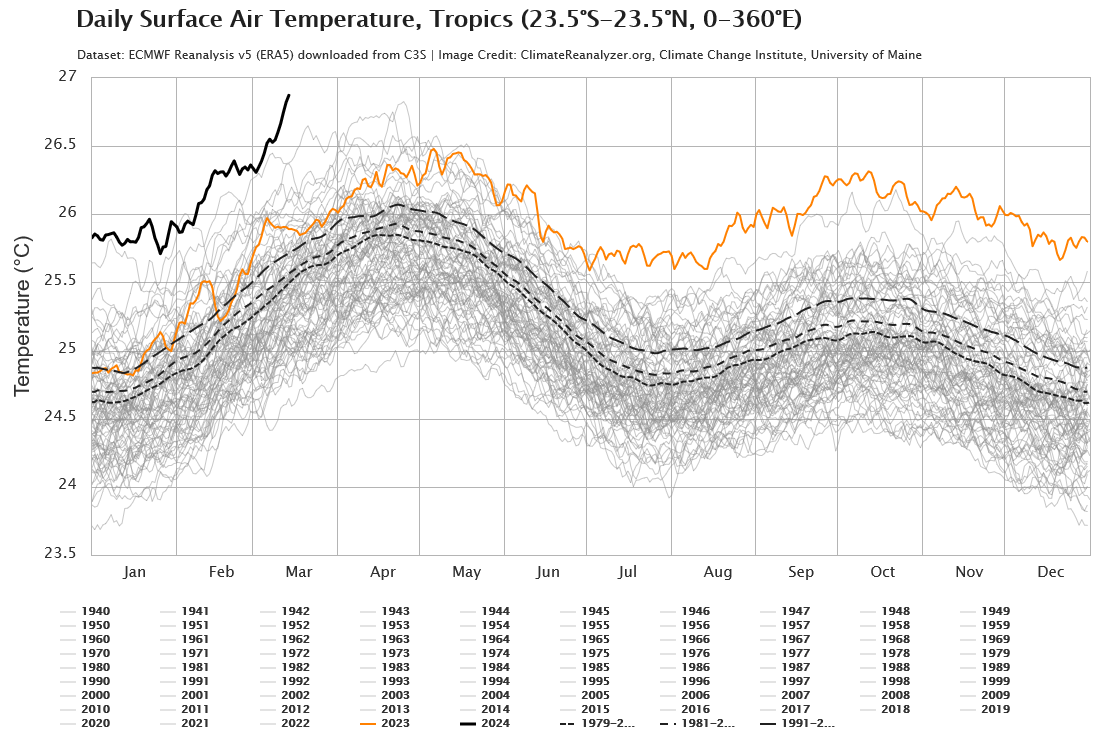 Denní teplota v tropickém pásmu od roku 1940 do současnosti – tlustá čára představuje letošní rok