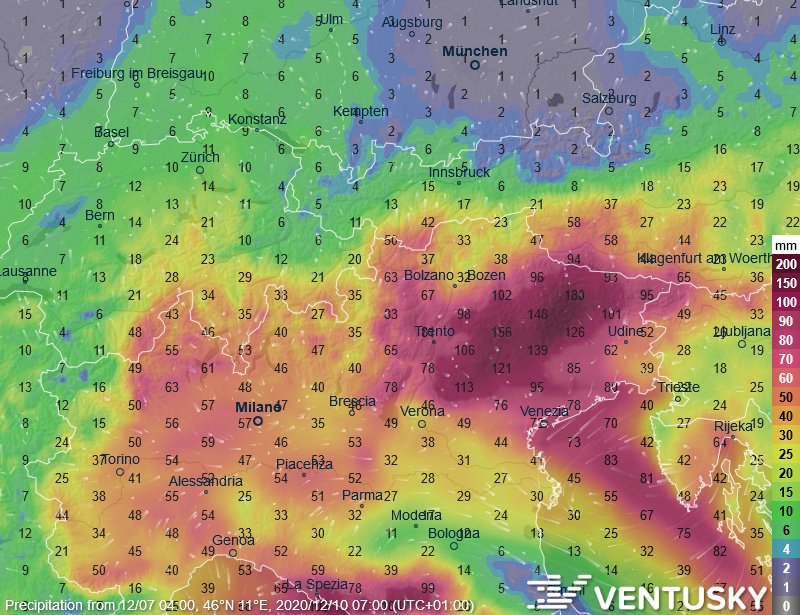 Očekávané srážky v Alpách v příštích 72 hodinách