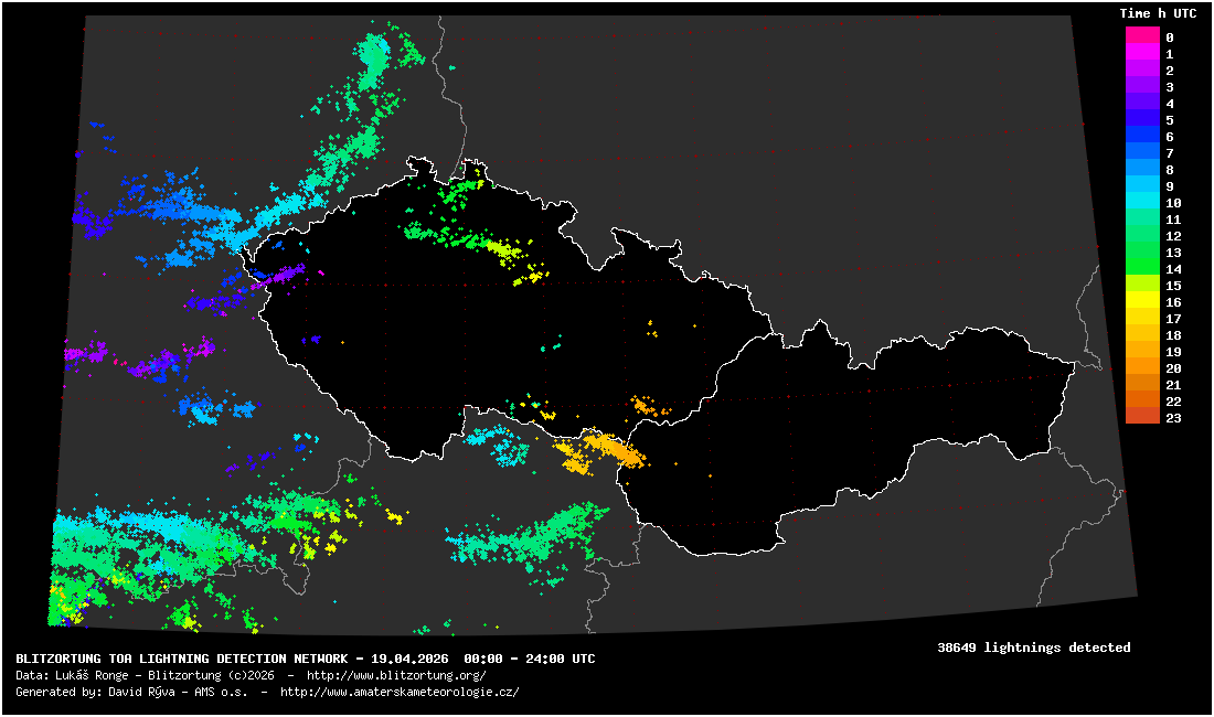Mapa blesků za včerejší den - barevně odlišeny dle času