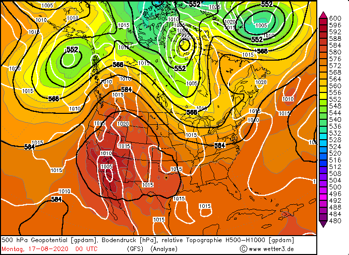 Analýza přízemního tlaku vzduchu (bílé čáry), výšky hladiny 500 hPa (barevně) a relativní topografie (černé čáry) v době, kdy byla naměřena extrémně vysoká teplota 54,4 °C v Údolí smrti. Nad jihovýchodní Kalifornií dosahuje výška hladiny 500 hPa mimořádně vysoké hodnoty kolem 5950 metrů