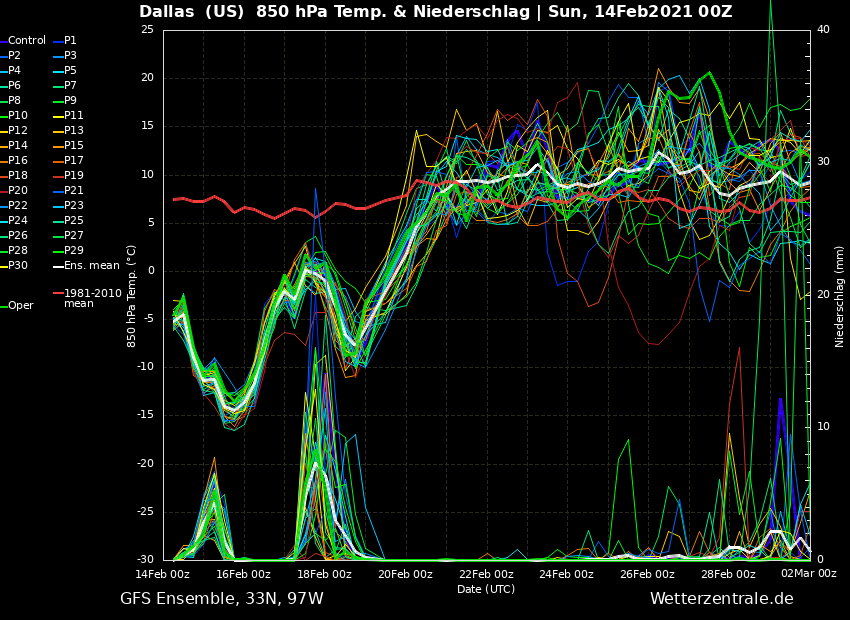 Ensemblová předpověď teploty v hladině 850 hPa (přibližně 1,5 km) a srážek pro Dallas – v pondělí 15. února 2021 bude teploty zhruba o 20 °C nižší než je dlouhodobý průměr (červená křivka)