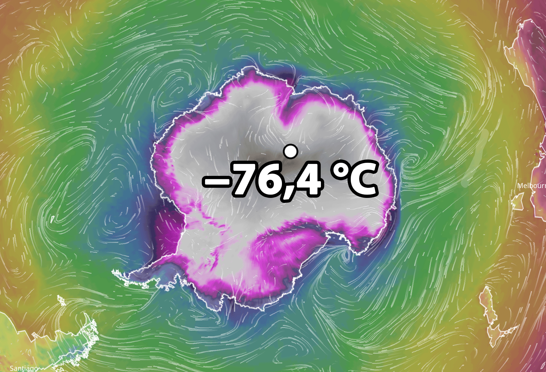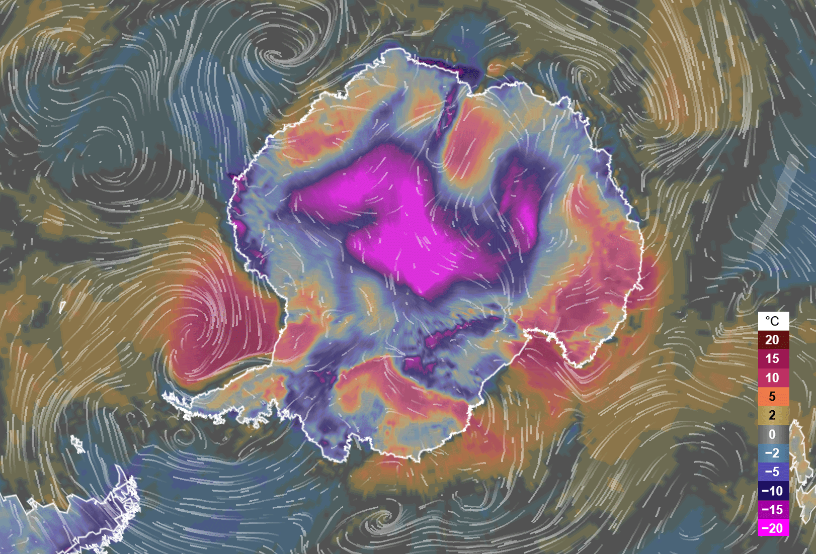 Odchylka teplot od průměru 24. března v Antarktidě - v centrální části byly výrazně podprůměrné, ale na pobřeží naopak nadprůměrné
