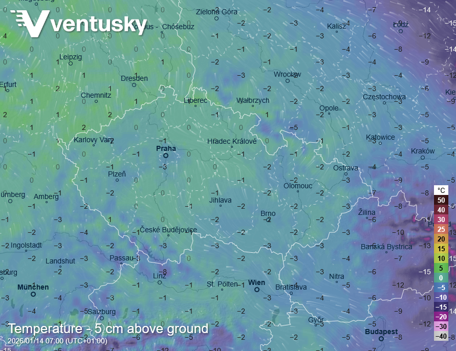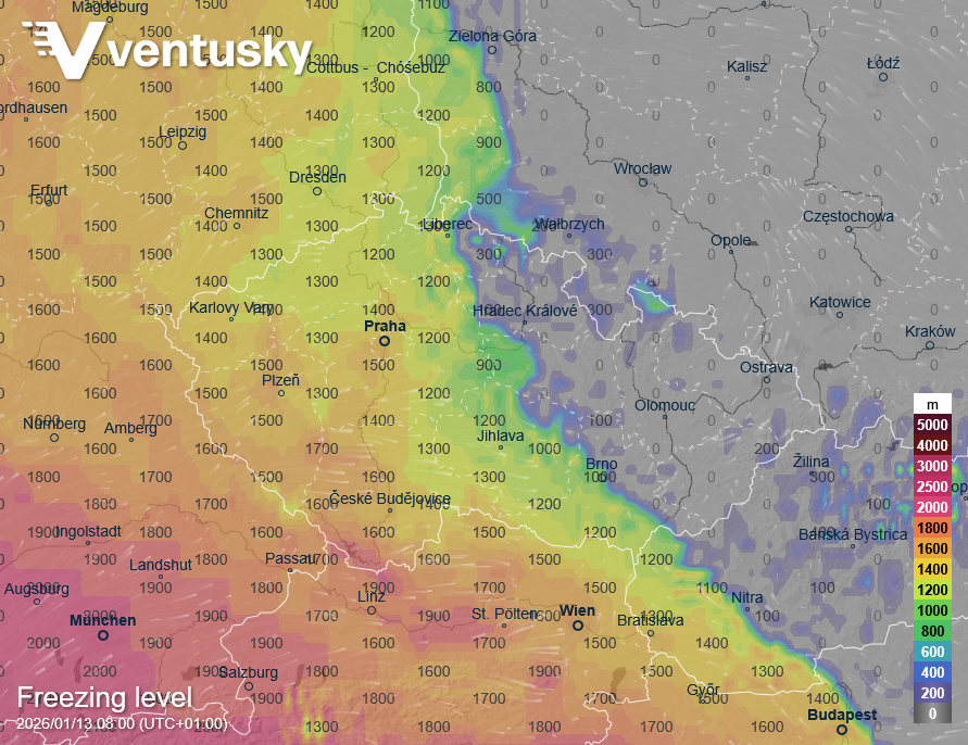 Výška nulové izotermy (tedy výška, od které se teploty pohybují výhradně pod bodem mrazu) v úterý ráno - ve žlutě až červeně vyznačených oblastech bude příliš vysoko na to, aby mohlo sněžit