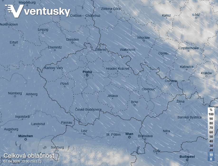 Mjnožství oblačnosti v úterý odpoledne - bude většinou jasno