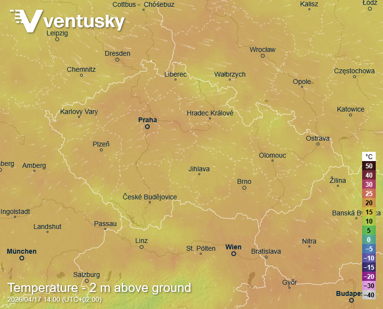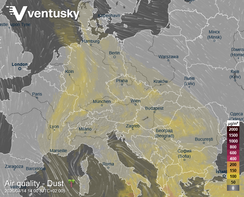 Koncentrace saharského prachu v úterý odpoledne v 10 metrech nad zemí