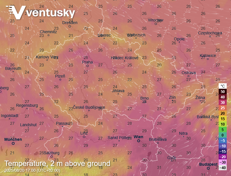 Očekávané teploty ve středu odpoledne - budou přes letních 25 °C