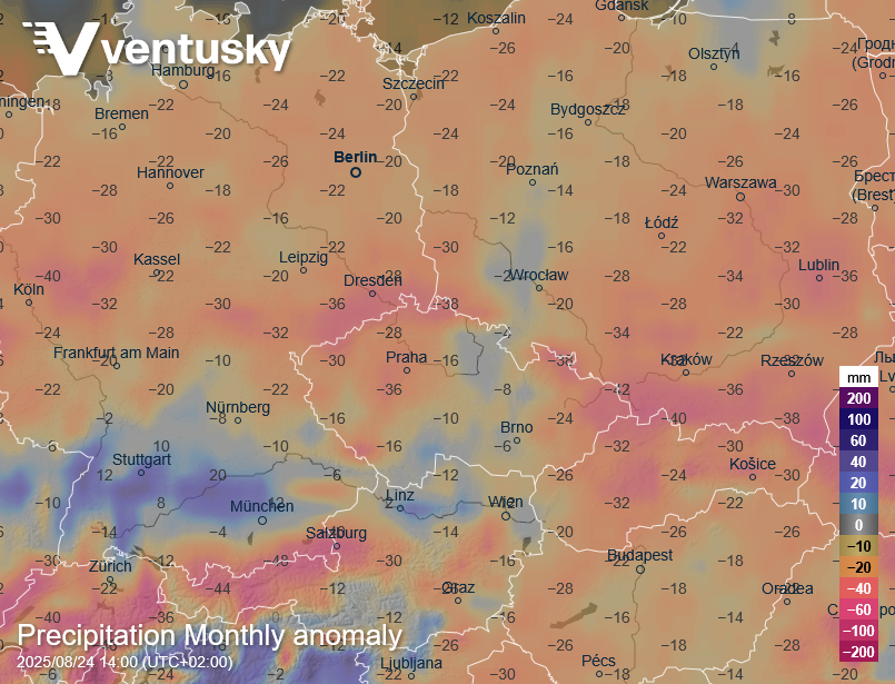 Očekávaný srážkový deficit za srpen na konci týdne 24. srpna - ve střední Evropě je srpen srážkově výrazně podprůměrný