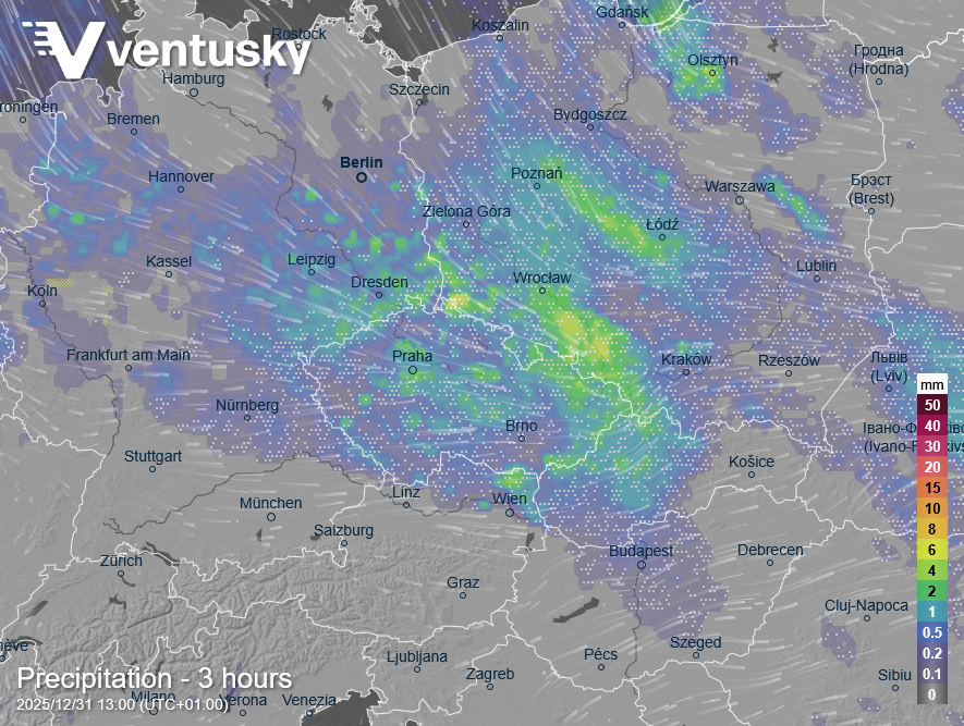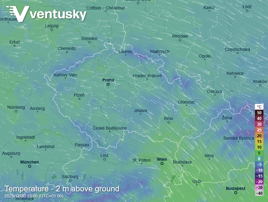Očekávané srážky ve středu v poledne - proudění tentokrát již bude vlhčí a bude tak přinášet sněžení, do severních hor i trvalejší