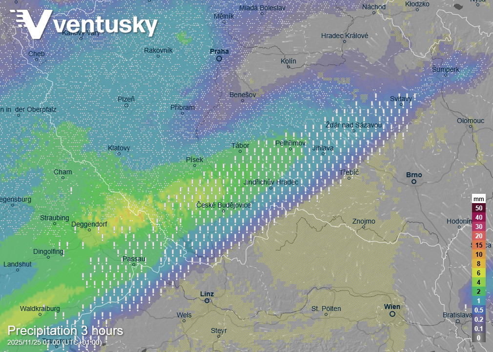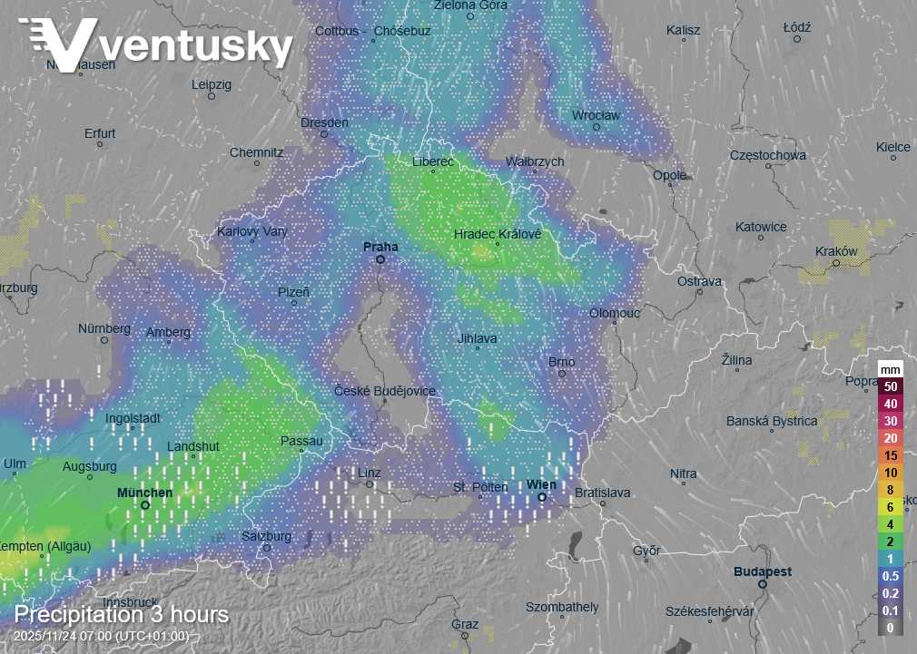 Mapa sněžení v pondělí ráno od 4:00 do 7:00 - na velké části území se utvoří slabá sněhová pokrývka