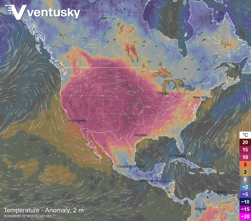 Odchylka teploty dnes odpoledne v Severní Americe od průměru za posledních 40 let