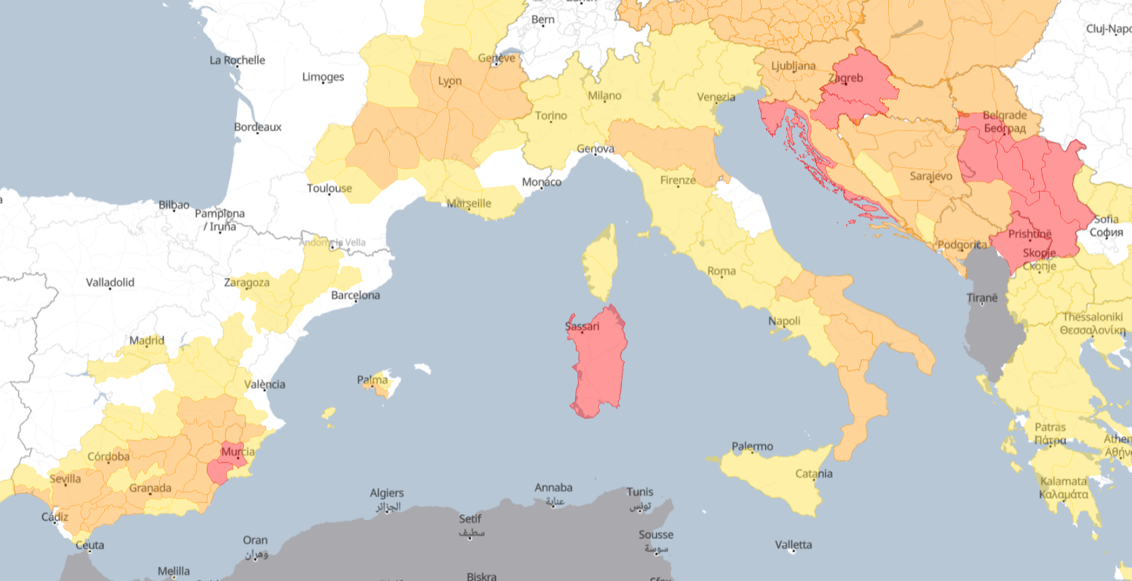 Odpolední teploty ve Španělsku v úterý 11. července - na jihu země se na řadě stanic dostaly přes 40 °C