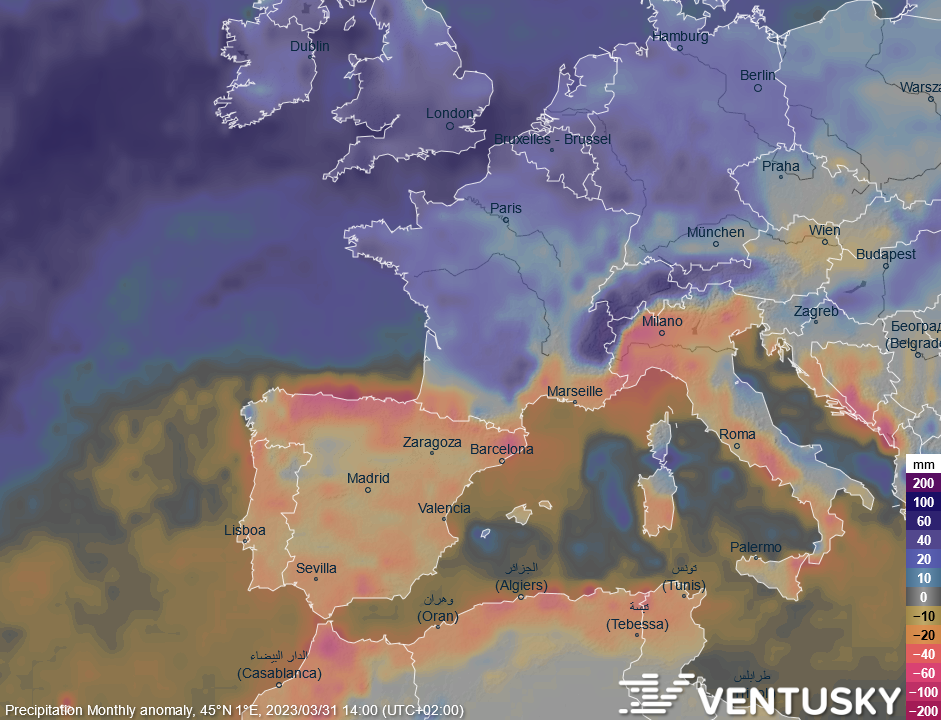 Odchylka srážek v březnu od dlouhodobého průměru - zatímco ve většině Evropy prší nadprůměrně, ve Středomoří je naopak srážek podprůměrně